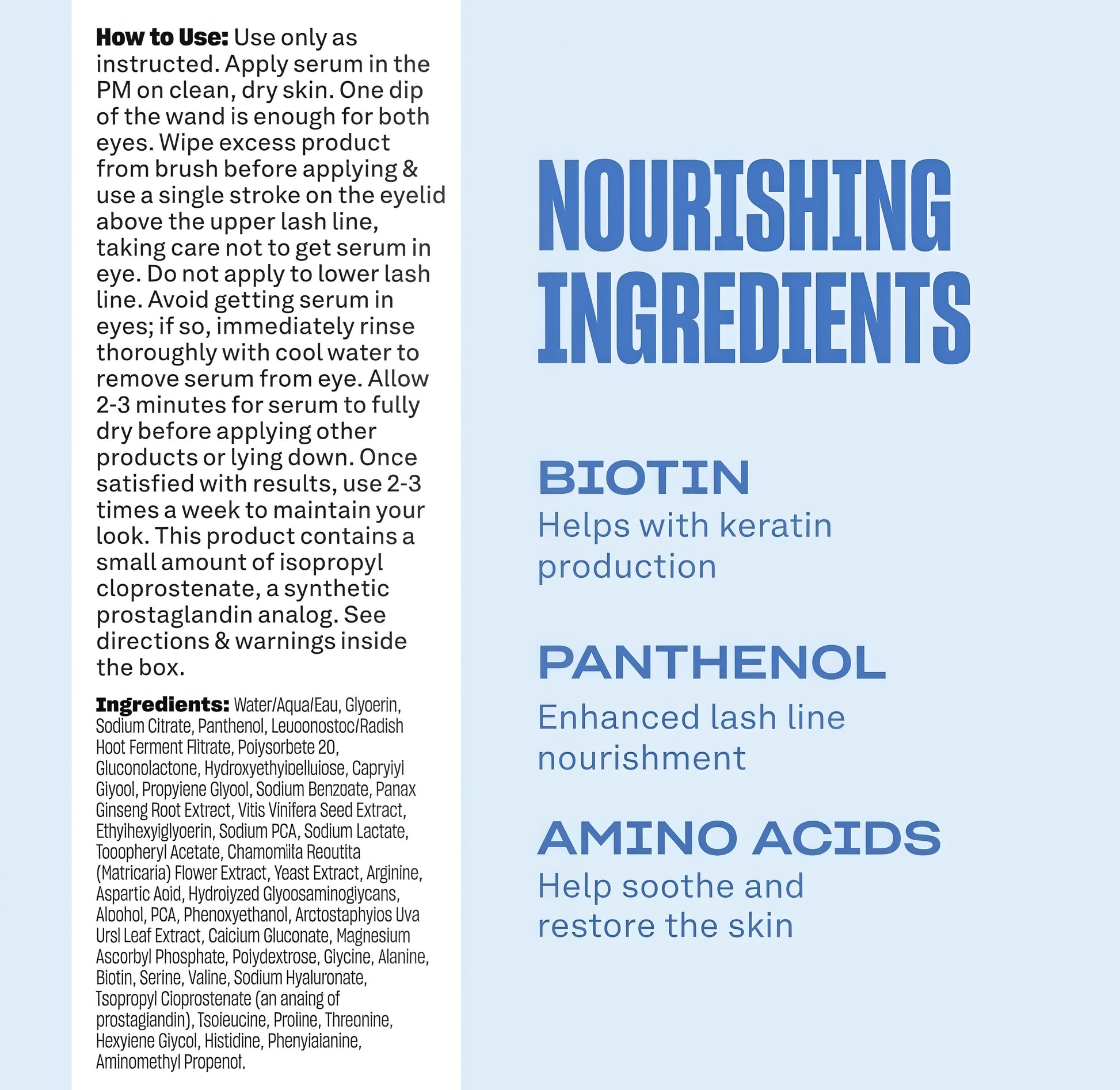Use only as instructed.Apply serum in the PM on clean, dry skin. One dip of thewand is enough for both eyes.Wipe excess product from brush before applying& use a single stroke on the eyelid above the upper lash line, taking care not toget serum in eye. Do not apply to lower lash line.Avoid getting serum in eyes; ifso,immediately rinse thoroughly with cool water to remove serum from eye.Allow 2-3 minutes for serum to fully dry before applying other products or lyingdown.Once satisfied with results, use 2-3 times a week to maintain your look.This product contains a small amount of isopropyl cloprostenate, a syntheticprostaglandin analog.See directions & warnings inside the box.